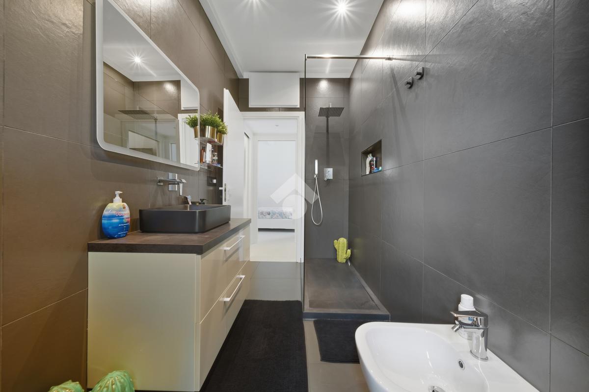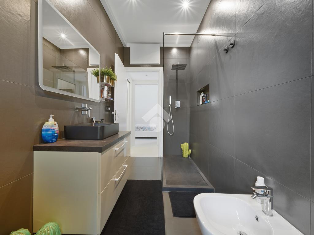 L’eleganza minimalista è stata ottenuta dall’utilizzo di linee pulite. Particolari sono la doccia walk-in e i sanitari sospesi. L’immobile è inoltre dotato di impianti di riscaldamento autonomo e dell’ aria condizionata.